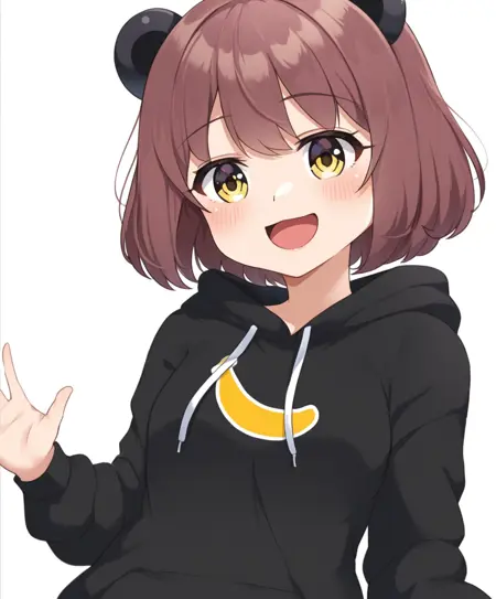 プロンプト:1girl, solo, pio, sun bear, animal ears, black bear ears, yellow eyes, brown hair, hair between eyes, bangs,