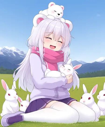 プロンプト:1girl, solo, neva, polar bear, animal ears, white bear ears, white hair, long hair, hair between eyes, bangs, blue eyes,