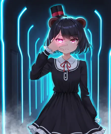 プロンプト:1girl, solo, rophys, black bear, animal ears, black bear ears, red eyes, heterochromia, short hair, black hair, neck ribbon, black ribbon, hat, mini hat, mini top hat, top hat, tilted headwear, black headwear