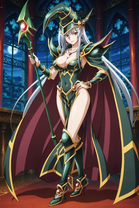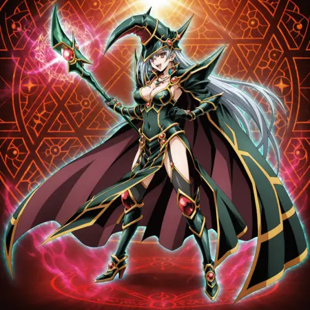 yugioh_card_style, yugioh_card_for_chaos_command_magician, 레드 아이즈, 은발, 긴 머리, 매우 긴 머리, 입술, 귀걸이, 목걸이, 큰 가슴, 관자뼈, 배꼽 덮음, 흉선, 미소, 마법사 모자, 긴 망토, 장갑, 화려한 갑옷, 금장식 갑옷, 녹색 및 검정 옷, 빨간 보석, 날카로운 어깨 갑옷, 갑옷 부츠, 판타지 복장, 신비로운 디자인, 하이힐, 녹색 지팡이 들고 있음