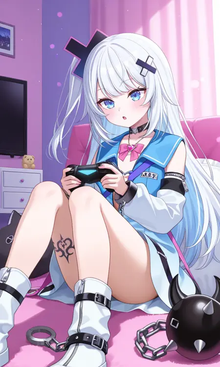 gintoge gumi, long hair, one side up, x hair ornament, blue dress, gradient dress, partially unzipped, detached sleeves, white sleeves, zipper pull tab, choker, pink bowtie, necklace, ribbon, heart o-ring, cuffs, leg tattoo- 靴: