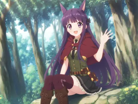 absurdres,official style,more details,lora:Kasumi5464:1,1girl,red capelet,solo,dog ears,long hair,capelet,thighhighs,purple eyes,purple hair,brown footwear,cross-laced footwear,green vest,extra ears,black skirt,necktie,:d,knee boots,very long hair,black necktie,brown belt,hair bow,forest,v,sitting,