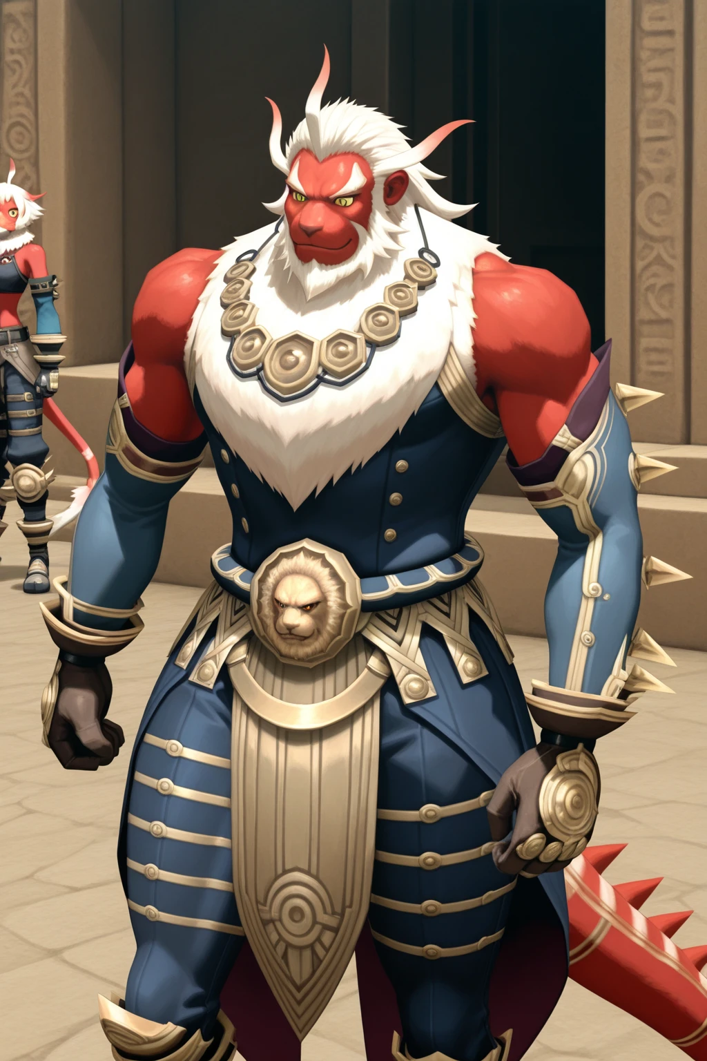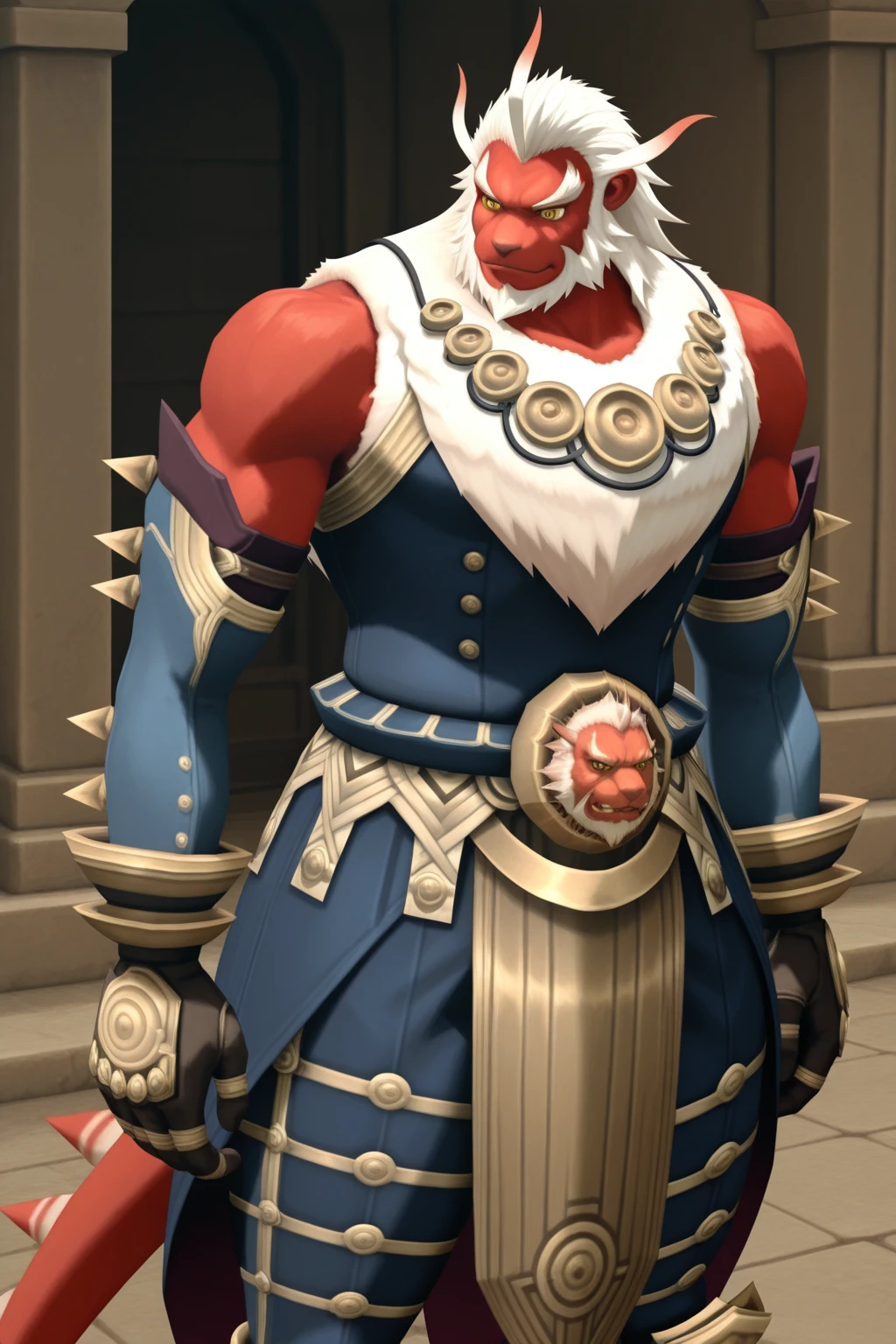 white hair, three ahoge, facial hair, beard, yellow eyes, thick eyebrows, furry male, muscular, red skin, red fur, tail,