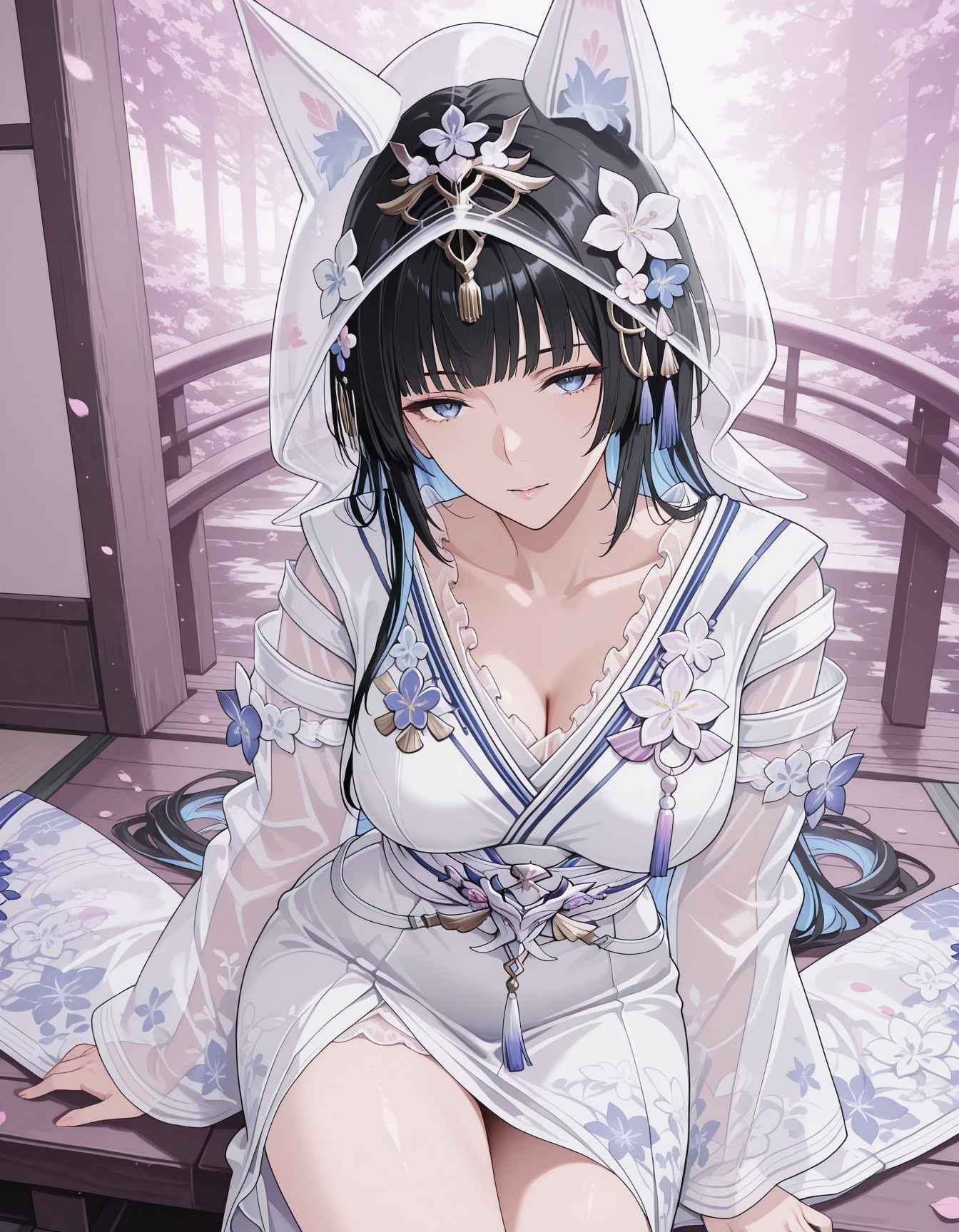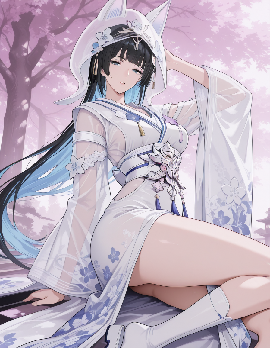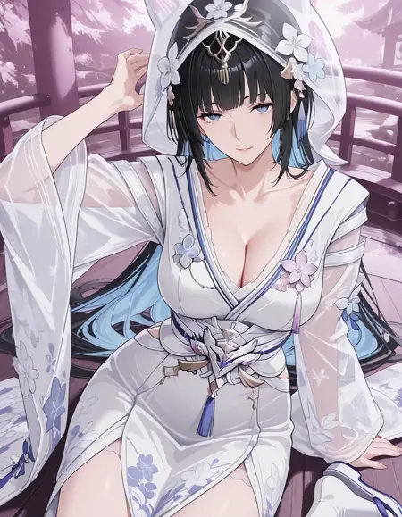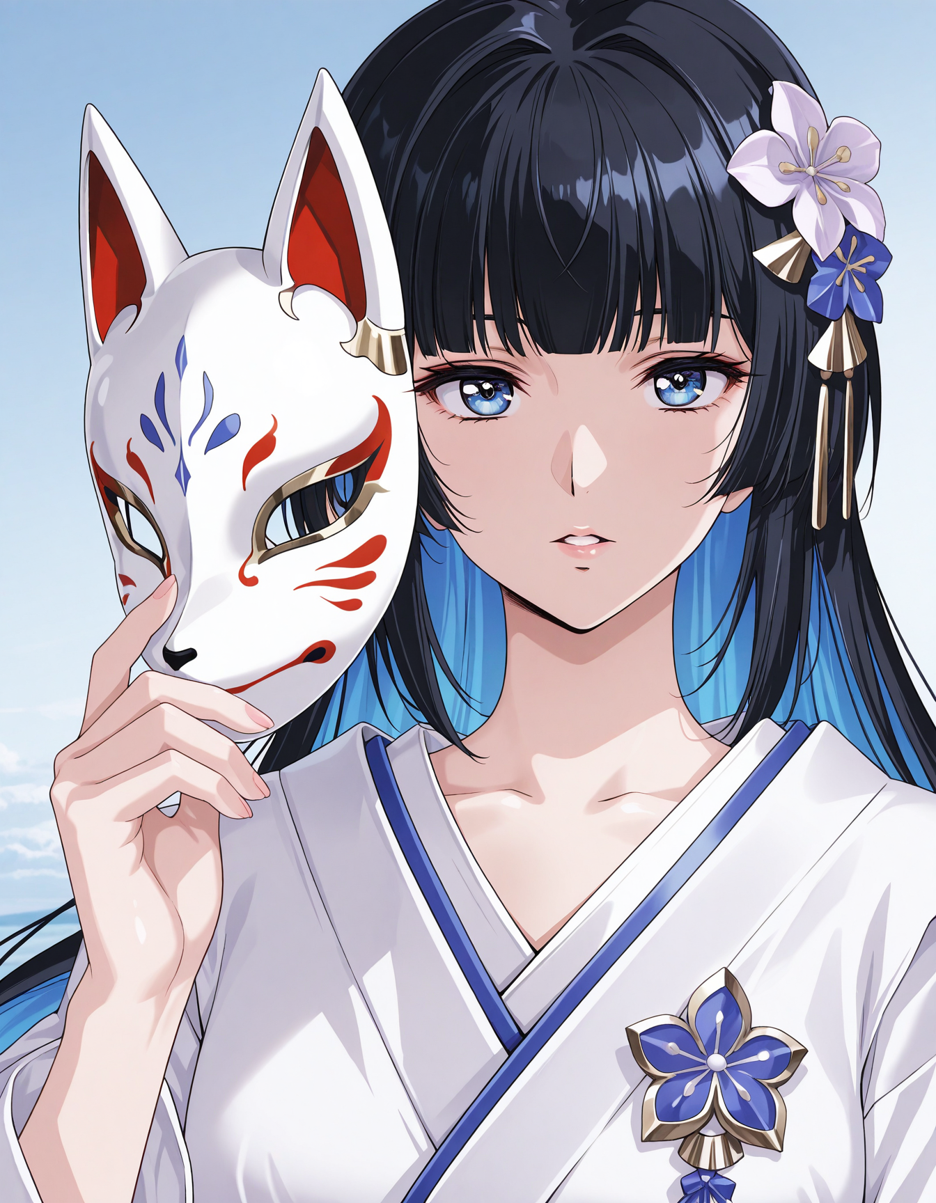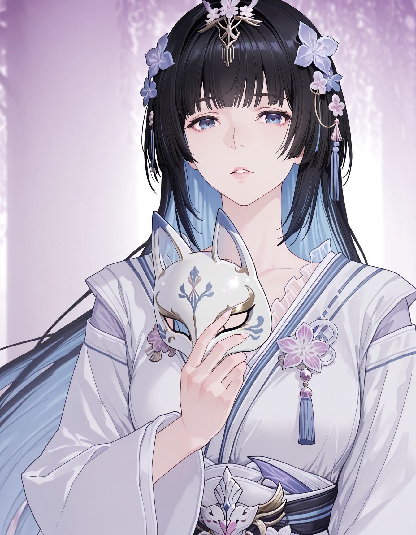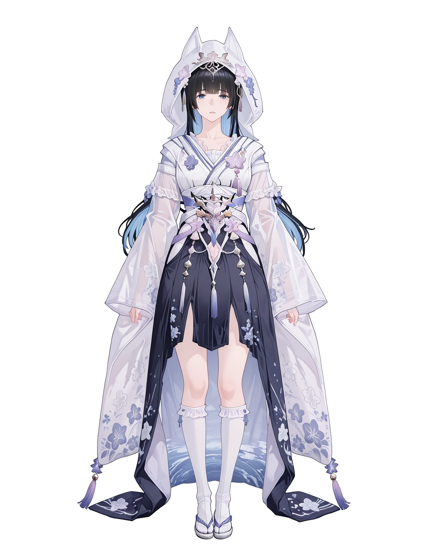 mai_pgr_selena_xs_yfqx,long_hair,black_hair,colored_inner_hair,blue_hair,blunt_bangs,blue_eyes,hair_ornament,hair_flower,jewelry,japanese_clothes,long_sleeves,wide_sleeves,blue_skirt,see-through,sash,floral_print,tassel,white_kimono,skirt,short_kimono,see-through_sleeves,kneehighs,tabi,frilled_socks,zouri,short_kimono,
