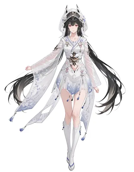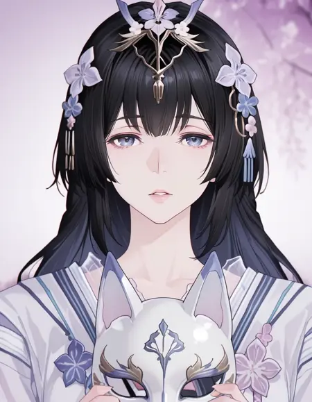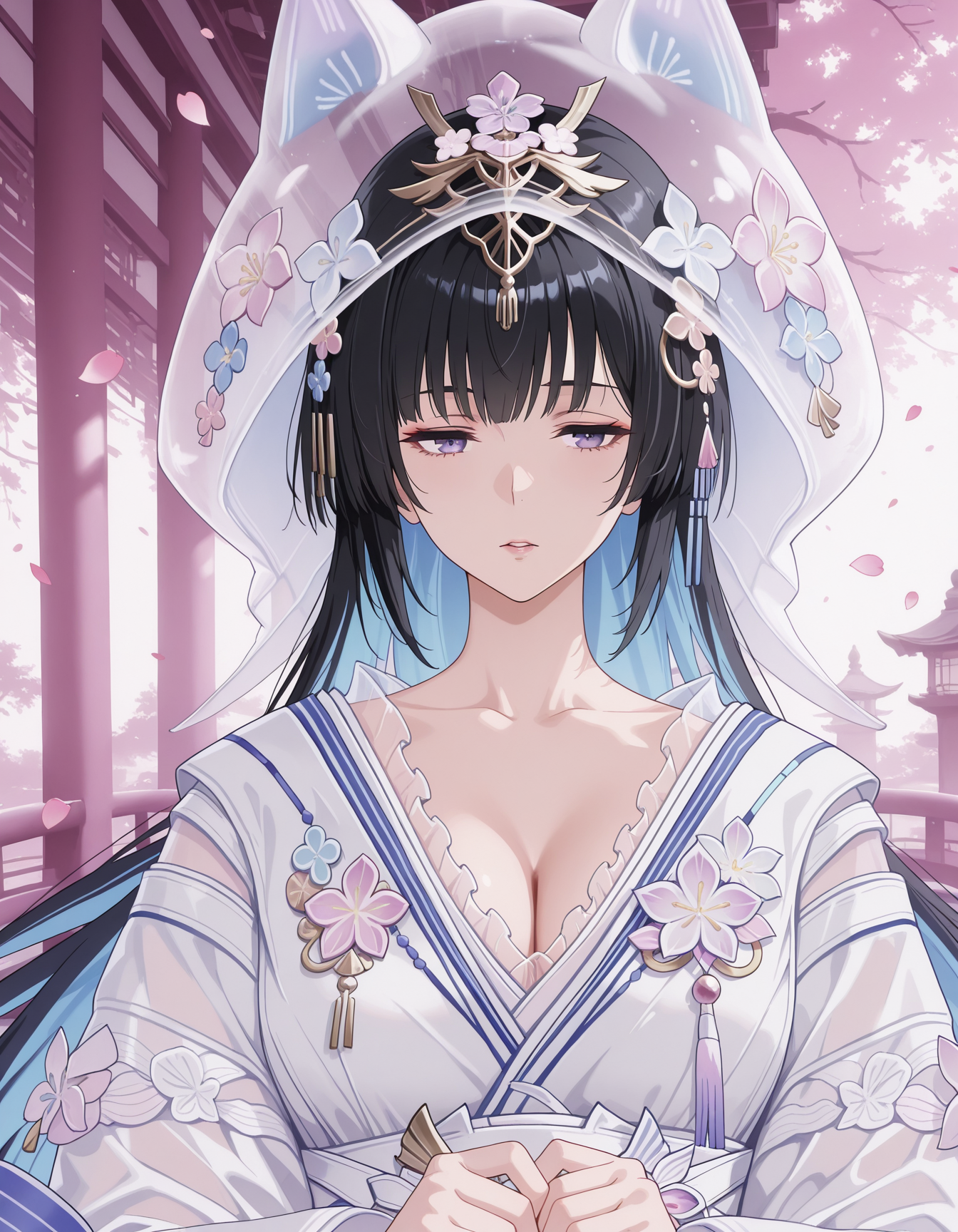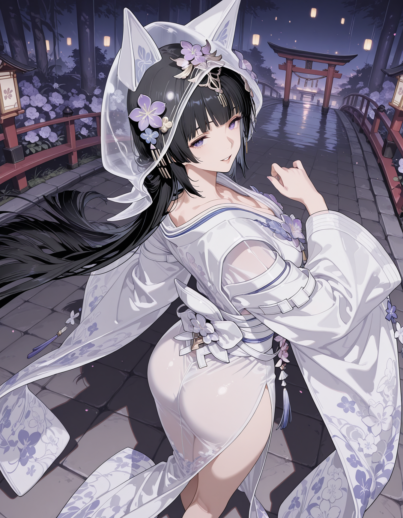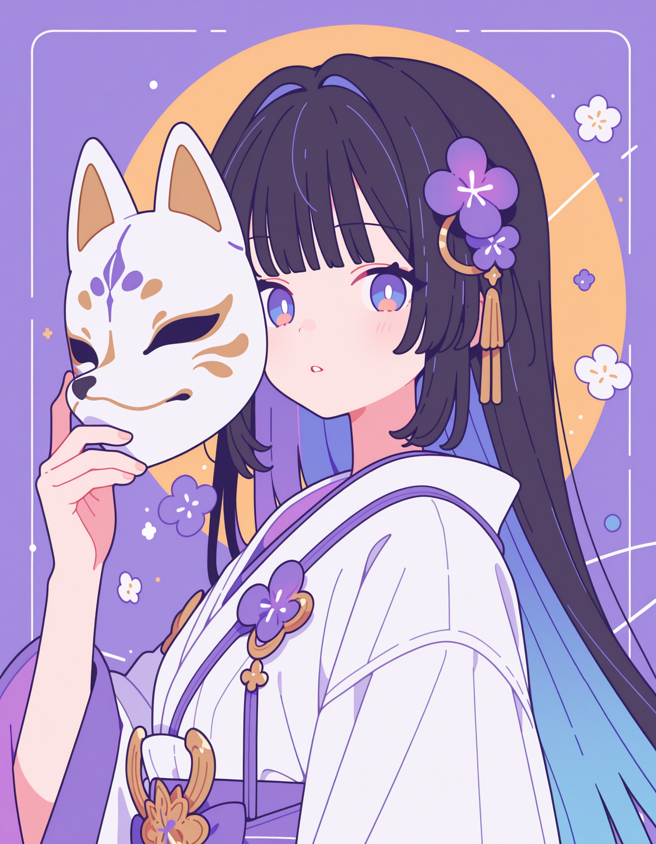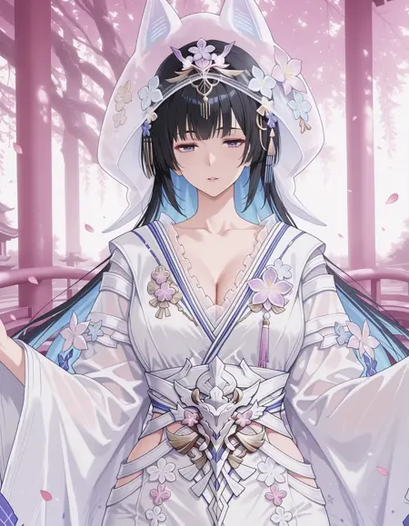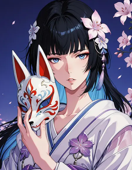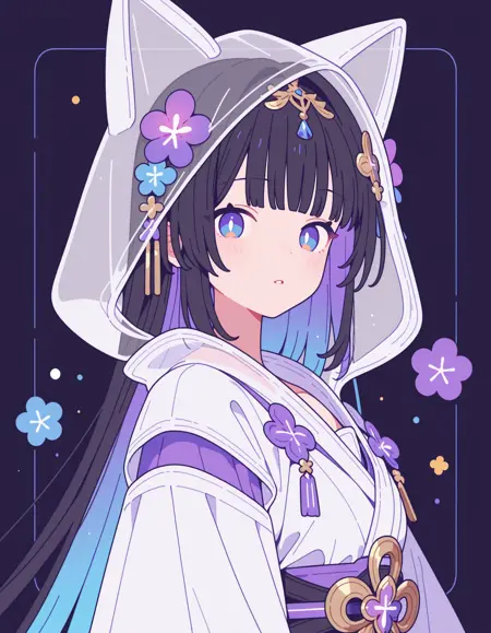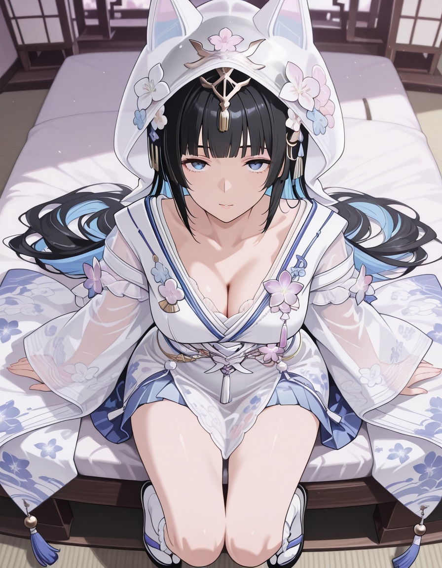 mai_pgr_selena_xs_yfqx,long_hair,black_hair,colored_inner_hair,blue_hair,blunt_bangs,blue_eyes,hair_ornament,hair_flower,jewelry,japanese_clothes,long_sleeves,wide_sleeves,blue_skirt,see-through,sash,floral_print,tassel,white_kimono,skirt,short_kimono,see-through_sleeves,kneehighs,tabi,frilled_socks,zouri,short_kimono,