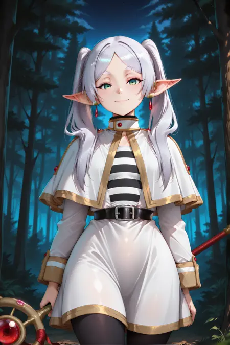 ilfrieren, 1girl, frieren, solo, pussy, pointy ears, uncensored, elf, green eyes, looking at viewer, twintails, jewelry, pantyhose, clothes pull, outdoors, earrings, capelet, clothes lift, from below, lifted by self, heart, white capelet, dangle earrings, closed mouth, long hair, drop earrings, striped shirt, black pantyhose, parted bangs, pantyhose pull, thighs, clitoris, tree, white hair, shirt, belt, forest, blush, cleft of venus, nature, grey hair<lora:illustrious frieren 896x1152:1>