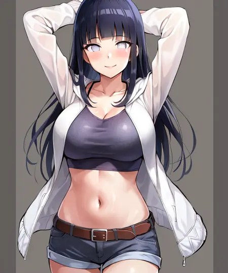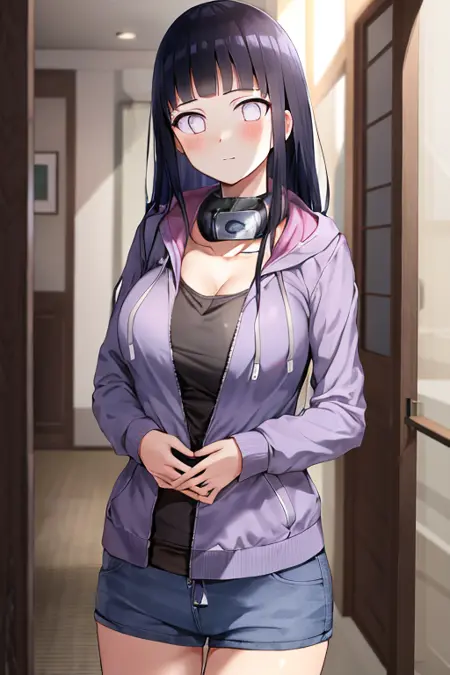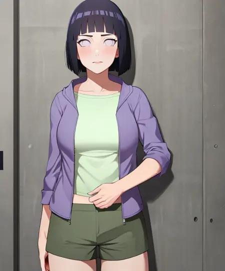 博人传款:hyuuga hinata, Hinata-Boruto-Outfit, purple_cropped_jacket, white_undershirt, green_shorts(可选:short_hair)。