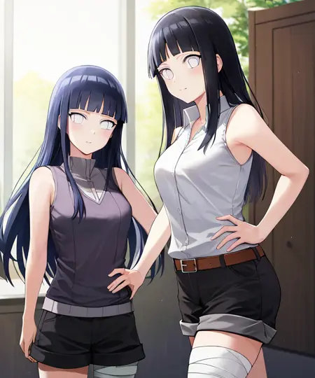 无袖款:hyuuga hinata, Hinata-Sleeveless-Outfit(推荐:sleeveless_shirt, black_shorts, bandaged_leg)。
