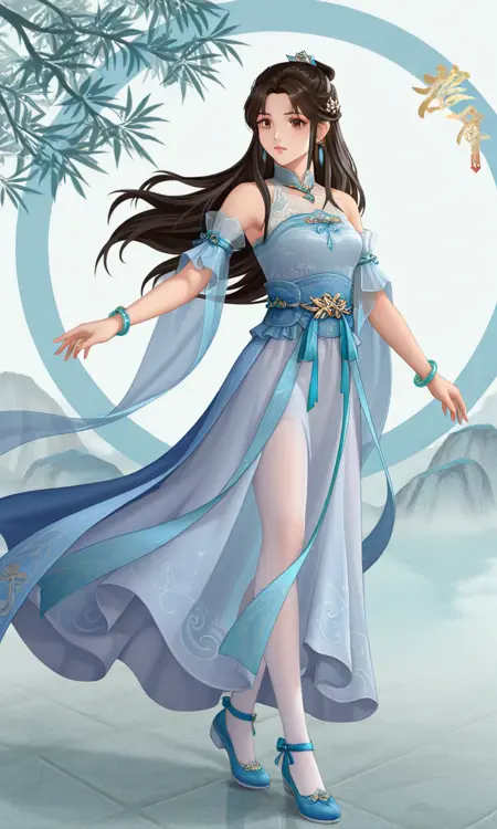 | トレーニングワード | XiaoXunEr,1girl,solo,long hair,dress,black hair,bare shoulders,hair ornament,detached sleeves,brown hair,blue dress,jewelry,sash,chinese clothes,brown eyes,earrings,hair bun,white_dress,ribbon,shoes,see-through,blue footwear,pantyhose,necklace,bracelet,half updo,realistic, 3D, realistic,コピーしました! |