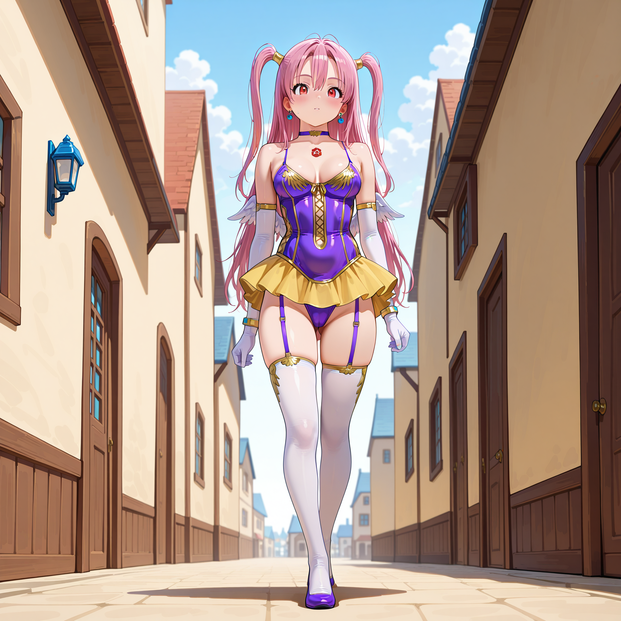 mystical_bustier,purple leotard,yellow skirt,elbow gloves,white gloves, garter straps ,choker,armlet,mini wings,white thighhighs,thighhighs, purple footwear,