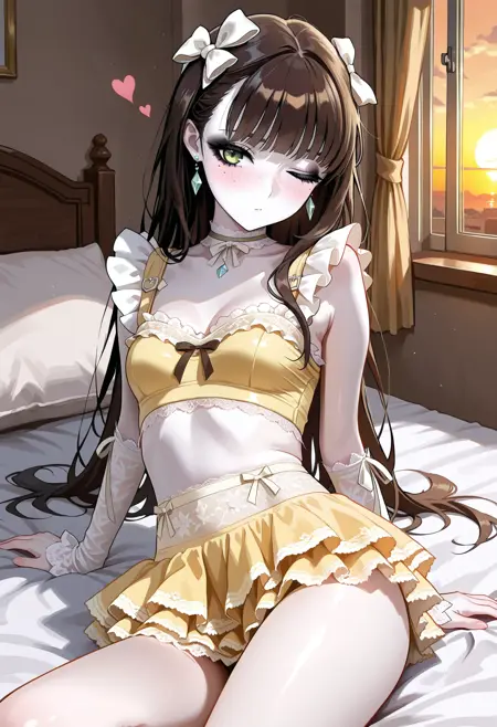 트리거 단어: akucool2piecesuit, 프릴, 레이스, 어깨 노출, 복부 노출, 상의, 미니 스커트, 리본, 헤어 리본, 초커, 리본,
