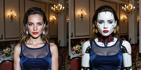 此微调模型可将任何输入图像转换为高保真未来主义机甲设计,采用流线型半透明装甲,搭配裸露的红黑线路与精密金色装饰,营造出高科技、工业与奢华融合的美学风格。