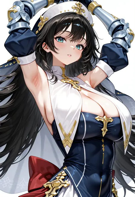 nun, cleavage, black dress, white skirt, white fishnet pantyhose, armored boots, detached sleeves, gauntlets