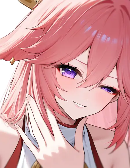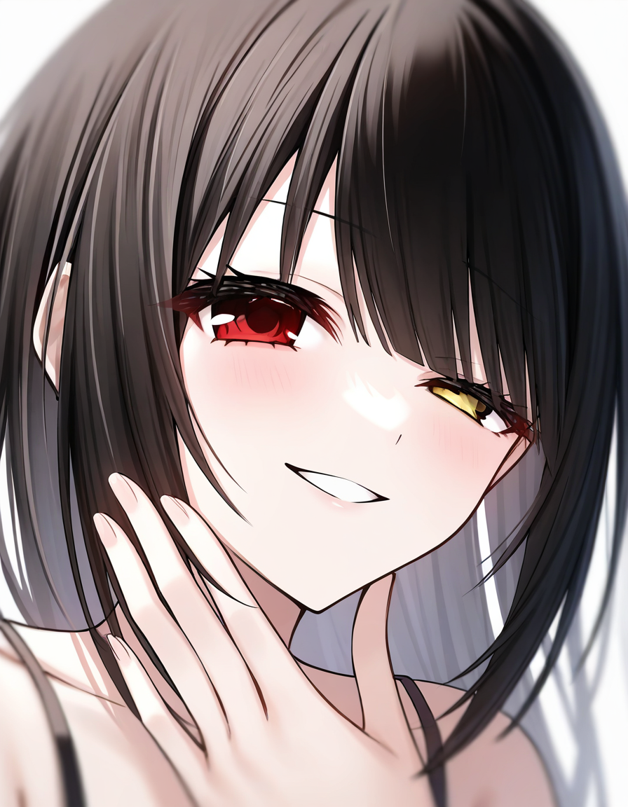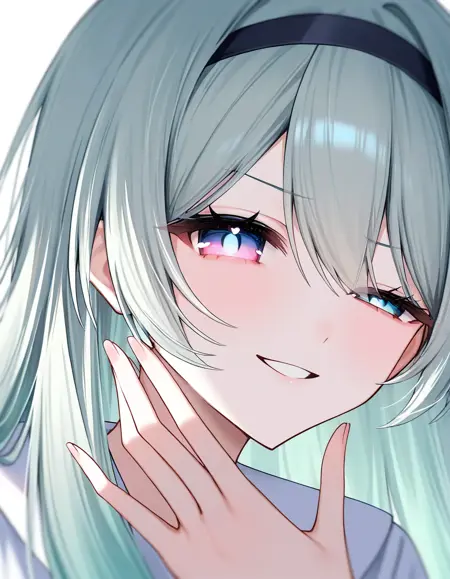 brmgbl,1girl,solo,looking at viewer, smile, portrait,half-closed eye,uneven eyes,hand on own neck
