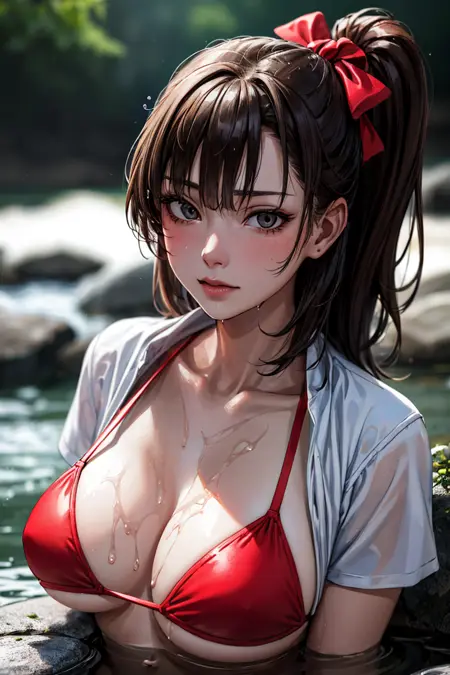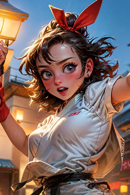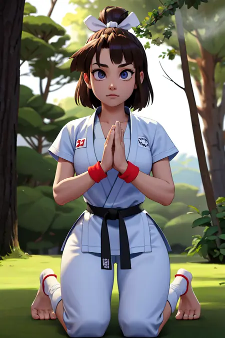 also: dougi, black belt, white pants, white top, fighting socks, bracelets, ribbon, side ponytail,