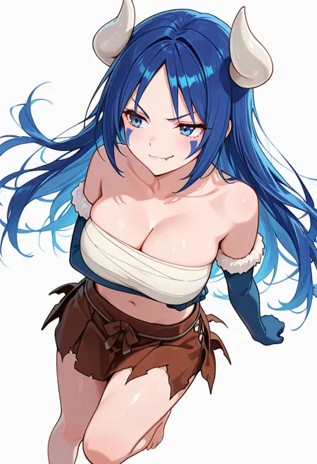 bakiko_cnr, 1girl, 蓝色头发, 长发, 闪亮头发, 刘海, 蓝色眼睛, 角, 露出獠牙, 面部标记, 大胸部,