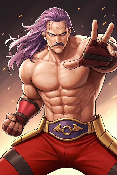 紫色の髪、長い髪、腹筋、顔の髭、手袋、指なし手袋、ひげ、ベルト、胸筋、顔の傷、赤いズボン