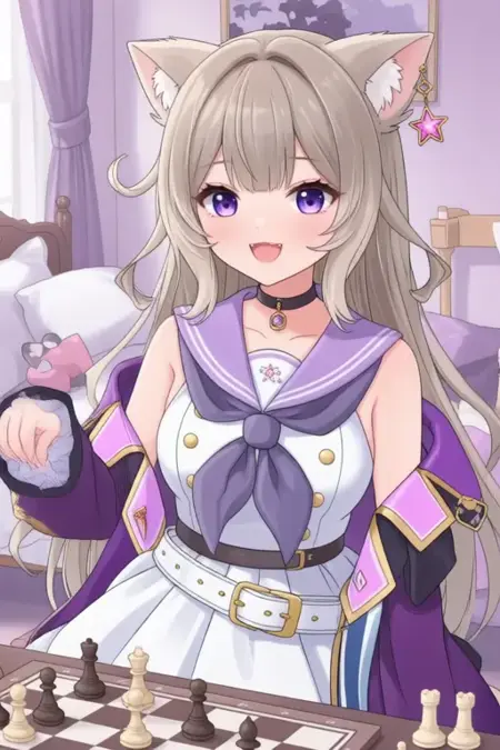 sample prompt:Yozuna Niu, anime-style girl. The image features an anime-style character with long, light brown hair that is styled in twin tails. The character has large, expressive purple eyes and cat ears on the top of their head, adorned with a small pink star accessory. They are wearing a white and purple outfit with a bow at the chest and gold buttons.and is wearing a white dress with gold buttons and a blue sash tied around the waist. The dress also has a white belt with a gold buckle. The outfit includes a choker with a small purple gem and a belt with a gold buckle. (she is dancing:2.5), (chibi Nendoroid:3.5) in bedroom.