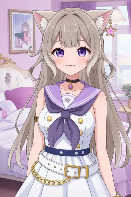 Trigger Word:Yozuna Niu, anime-style girl. The image features an anime-style character with long, light brown hair that is styled in twin tails. The character has large, expressive purple eyes and cat ears on the top of their head, adorned with a small pink star accessory. They are wearing a white and purple outfit with a bow at the chest and gold buttons.and is wearing a white dress with gold buttons and a blue sash tied around the waist. The dress also has a white belt with a gold buckle. The outfit includes a choker with a small purple gem and a belt with a gold buckle.