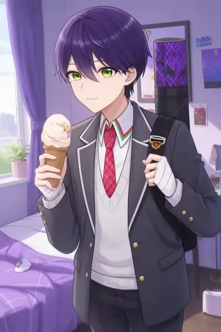 触发词:Kenmochi Toya,动漫风格男孩。画面中的角色拥有短发,呈深紫色,发型随意。角色双眼为绿色,身穿校服,包括白色衬衫、红色领带和深色西装外套,配有金色纽扣。角色还背着一个黑色背包,上有紫色图案。