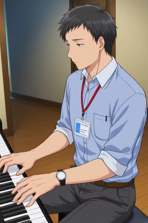 트리거 단어: Yashiro Kizuku, 애니메이션 스타일 소년. 이미지는 짧고 검은 머리를 캐주얼하게 스타일링한 인물을 묘사합니다. 이 인물은 밝은 파란색 버튼 셔츠를 입고 있으며, 팔꿈치까지 소매를 걷어올렸습니다. 목에는 빨간 란야드에 ID 카드가 걸려 있으며, 카드의 배경은 파란색이고 텍스트가 일부 표시되어 있습니다. 또한 검은 회색 바지를 입고 있으며, 갈색 벨트와 왼손목에는 검정색 손목시계를 착용했습니다.