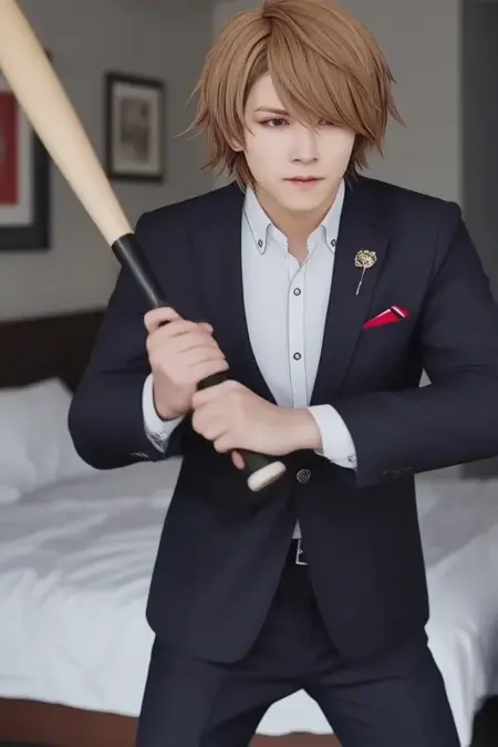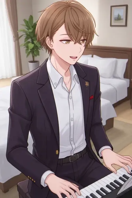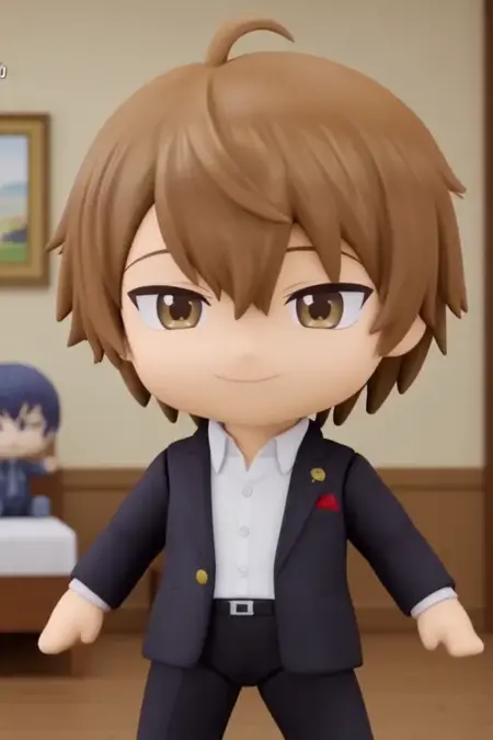 sample prompt:Kagami Hayato, anime-style boy. The image features a person with light brown hair styled in a casual, slightly tousled manner. They are wearing a dark suit jacket over a white dress shirt,paired with matching trousers, which is buttoned up to the collar. The suit jacket has a pin or badge on the left lapel and a red pocket square in the breast pocket. (she is dancing:2.5), (chibi Nendoroid:3.5) in bedroom.