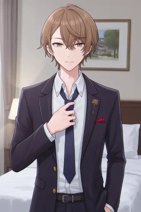 Trigger Word:Kagami Hayato, anime-style boy. The image features a person with light brown hair styled in a casual, slightly tousled manner. They are wearing a dark suit jacket over a white dress shirt,paired with matching trousers, which is buttoned up to the collar. The suit jacket has a pin or badge on the left lapel and a red pocket square in the breast pocket.