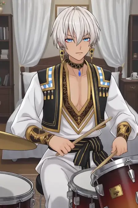 트리거 단어: Ibrahim, 애니메이션 스타일 소년. 이미지에는 흰색 머리카락이 짧고 솔처럼 뾰족하게 스타일링된 캐릭터가 포함되어 있습니다. 머리카락은 깔끔하게 뒤로 묶여 캐릭터의 얼굴이 드러나 있습니다. 캐릭터는 창백한 피부에 어울려 두드러지는 파란 눈을 가지고 있습니다. 캐릭터는 흰색 로브에 금과 검은색 장식이 있는 정교한 옷을 입고 있으며, 로브는 높은 칼라를 갖고 있으며 복잡한 디자인과 무늬로 장식되어 있고, 파란 펜던트가 달린 초커를 착용하고 있습니다. 캐릭터는 로브 위에 검은색과 금색 조끼를 입고 있으며, 앞면에 일련의 단추가 있습니다. 조끼는 높은 칼라를 갖고 있으며 금색 테두리로 장식되어 있습니다.