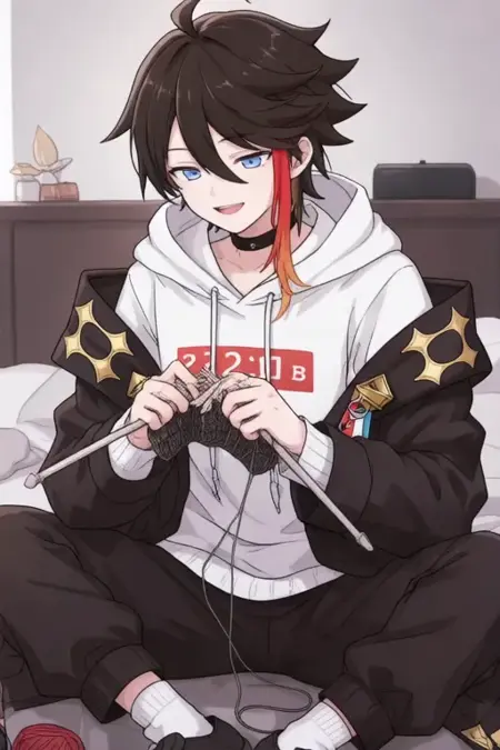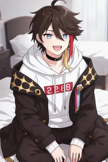 触发词:Saegusa Akina,动漫风格男孩。图像中的角色为动漫风格,拥有深棕色头发,发型凌乱微翘。角色右侧脸颊有一缕明亮的红色发丝,与其余深色头发形成鲜明对比。其双眼为醒目的蓝色,增强了表情的生动感。角色身穿白色连帽衫,高领设计,肩部带有金色装饰,前襟敞开。连帽衫颈部戴有黑色项圈,左侧有一个小标签,写着“221B”。角色还穿着一件黑色夹克,带有金色装饰,包括白色领口和袖口。连帽衫搭配深色宽松长裤,并穿着白色袜子和黑色鞋子。