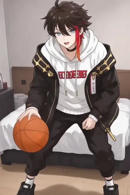 示例提示:Saegusa Akina,动漫风格男孩。图像中的角色为动漫风格,拥有深棕色头发,发型凌乱微翘。角色右侧脸颊有一缕明亮的红色发丝,与其余深色头发形成鲜明对比。其双眼为醒目的蓝色,增强了表情的生动感。角色身穿白色连帽衫,高领设计,肩部带有金色装饰,前襟敞开。连帽衫颈部戴有黑色项圈,左侧有一个小标签,写着“221B”。角色还穿着一件黑色夹克,带有金色装饰,包括白色领口和袖口。连帽衫搭配深色宽松长裤,并穿着白色袜子和黑色鞋子。(她正在跳舞:2.5),(Q版Nendoroid:3.5)在卧室中。