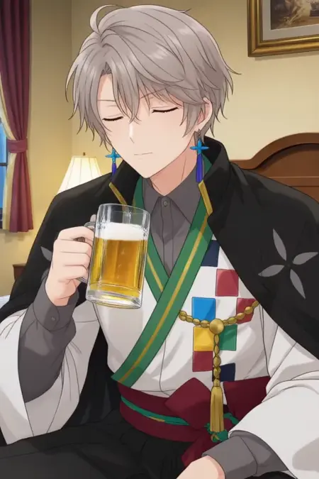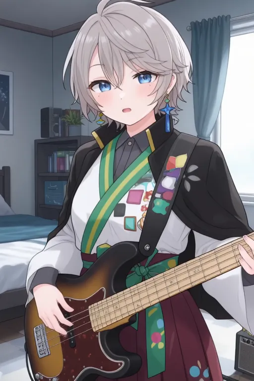 Trigger Word:Kaida Haru, anime-style boy. The image features an anime-style character with light gray hair styled in a messy, slightly tousled manner. The character has striking blue eyes and is wearing a black jacket over a white shirt with a green sash tied around the waist. The sash has colorful square patterns on it. The character is also adorned with blue earrings that have a star-like design and is wearing a traditional outfit that includes a white shirt with black sleeves, a dark green sash, and a maroon skirt.