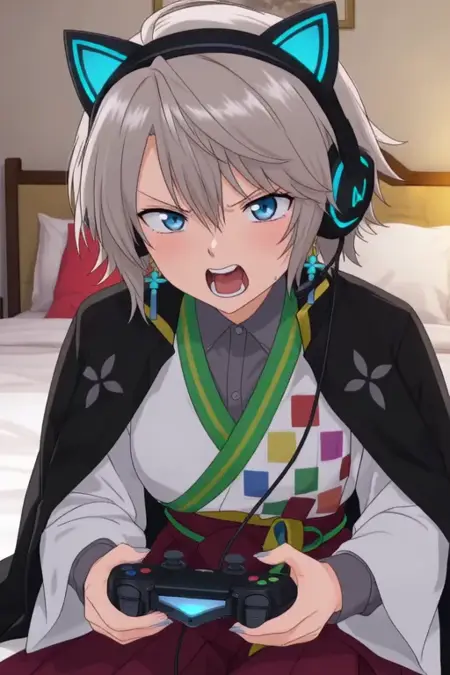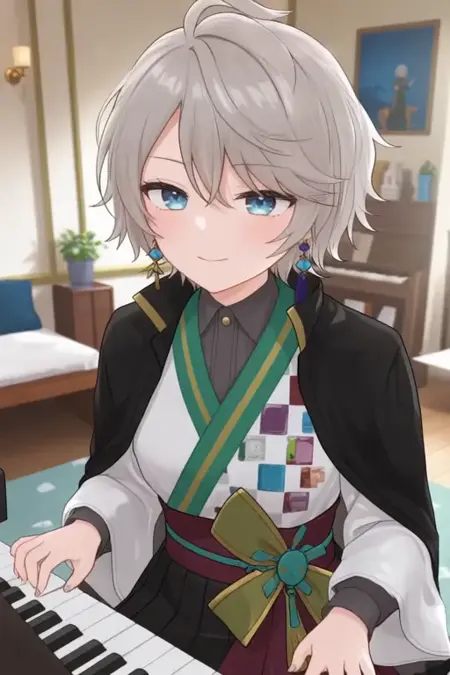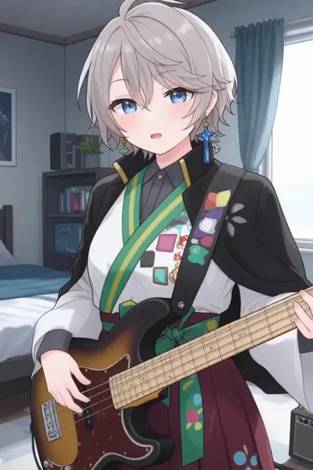sample prompt:Kaida Haru, anime-style boy. The image features an anime-style character with light gray hair styled in a messy, slightly tousled manner. The character has striking blue eyes and is wearing a black jacket over a white shirt with a green sash tied around the waist. The sash has colorful square patterns on it. The character is also adorned with blue earrings that have a star-like design and is wearing a traditional outfit that includes a white shirt with black sleeves, a dark green sash, and a maroon skirt. (she is dancing:2.5), (chibi Nendoroid:3.5) in bedroom.