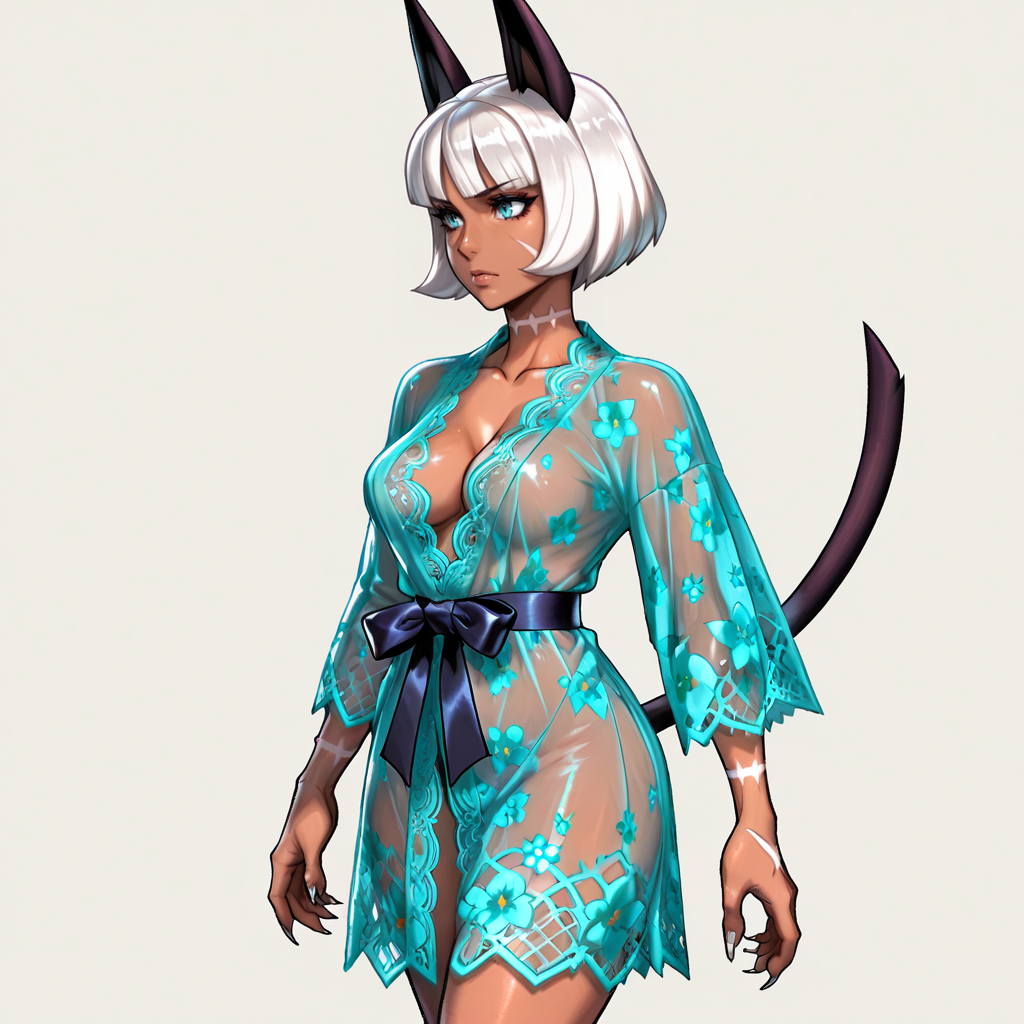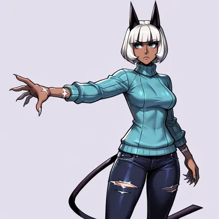 Trigger :MsFortune, 1girl, cat tail, animal ears, crop top, dark skin, bob cut, dark-skinned female, white hair, midriff, short hair, blue eyes, sharp toenails, fingerless gloves, collar, claws, medium breasts, scar, neck bell, belt pouch, navel, underboob, cowboy shot