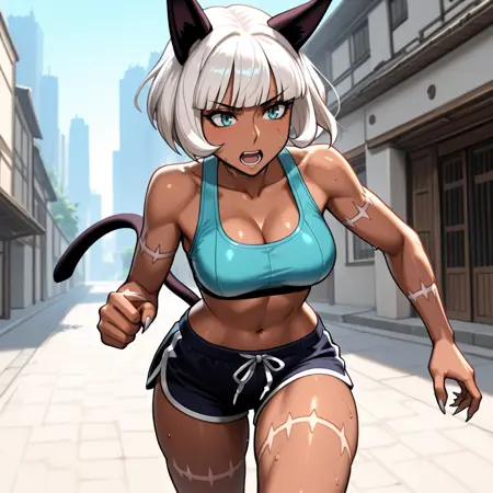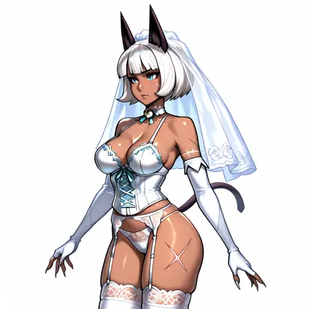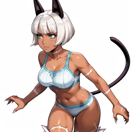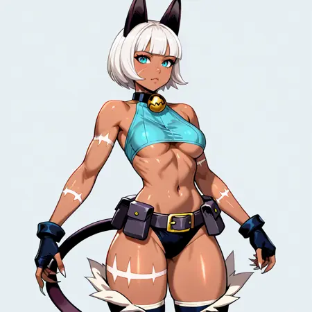 Trigger with fan art: MsFortuneFanArt, 1girl, animal ears, cat tail, crop top, fingerless gloves, medium breasts, dark skin, dark-skinned female, short hair, midriff, underboob, white hair, scar, fingernails, navel, bob cut, collar, bare shoulders, neck bell, blue eyes, belt pouch, claws