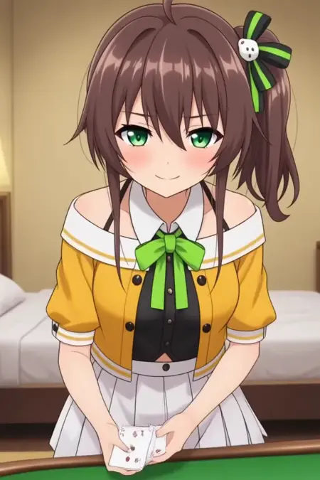 Trigger Word:Natsuiro Matsuri, anime-style girl. The image features an anime-style character with brown hair styled in twin tails, each adorned with a green ribbon. The character has green eyes and is wearing a yellow jacket over a white shirt with a green bow at the collar. The jacket has black buttons and a white collar.The outfit includes a short-sleeved top with puffed sleeves and a white skirt that reaches just above the knees.