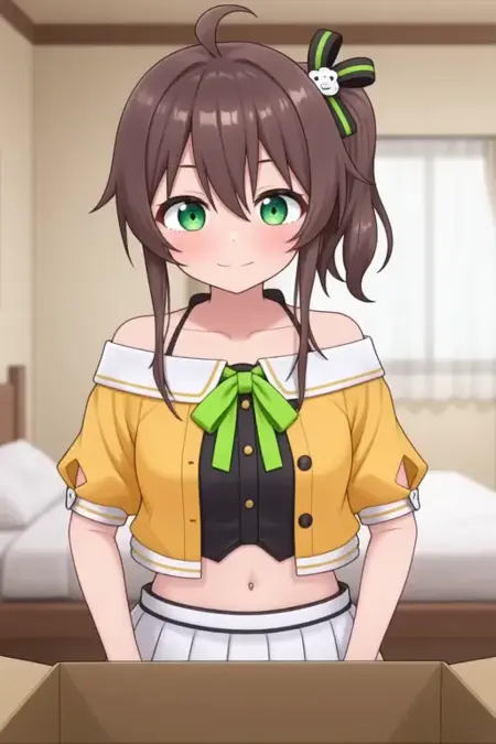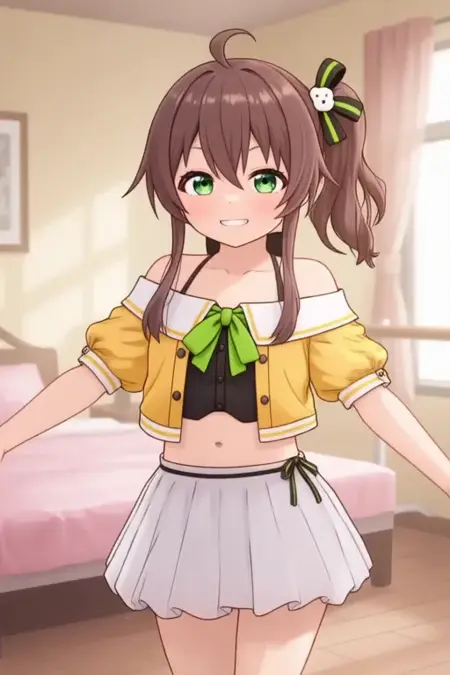 sample prompt:Natsuiro Matsuri, anime-style girl. The image features an anime-style character with brown hair styled in twin tails, each adorned with a green ribbon. The character has green eyes and is wearing a yellow jacket over a white shirt with a green bow at the collar. The jacket has black buttons and a white collar.The outfit includes a short-sleeved top with puffed sleeves and a white skirt that reaches just above the knees. (she is dancing:2.5), (chibi Nendoroid:3.5) in bedroom.