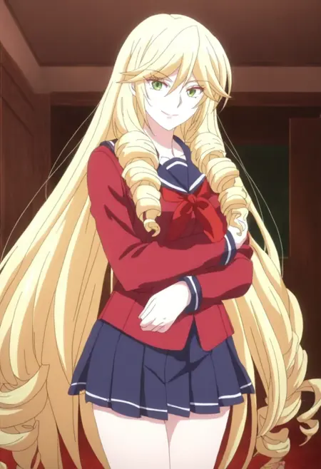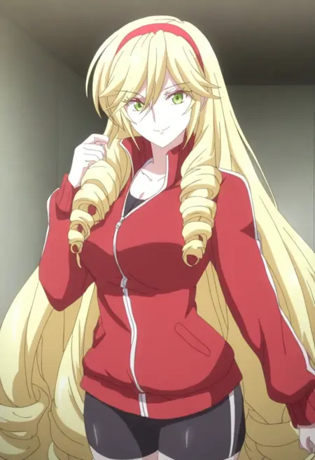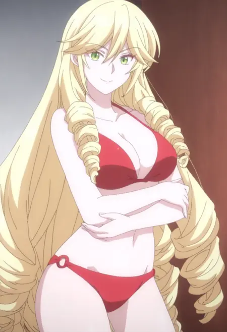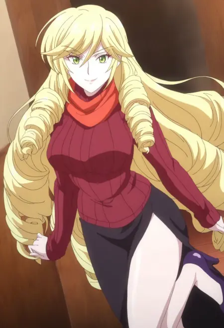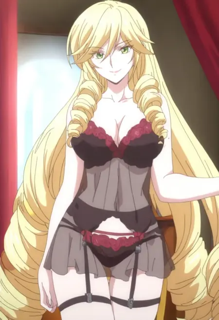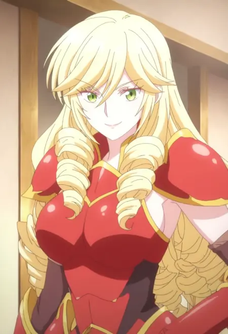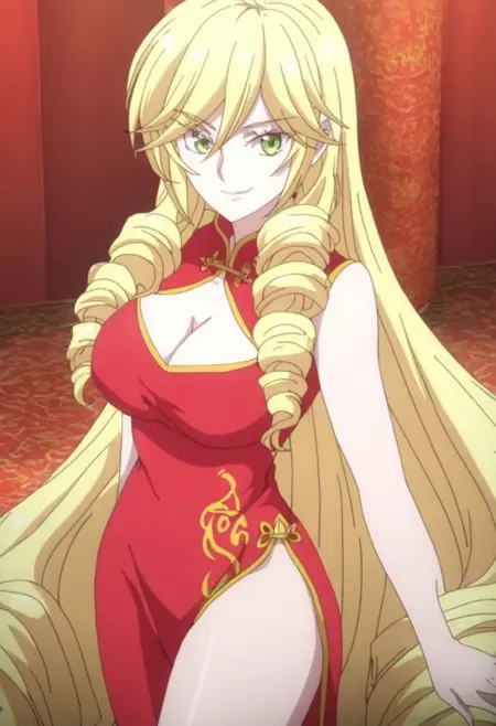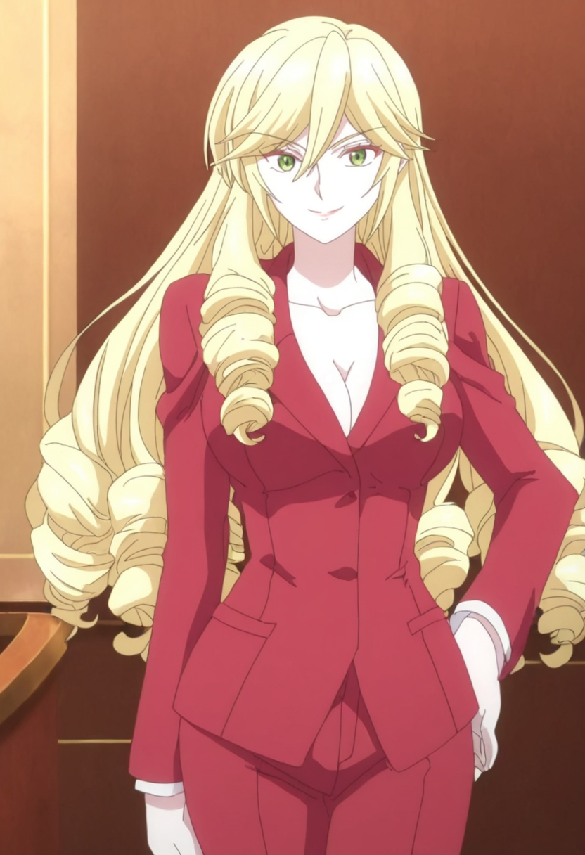 scarlet_sherry_jamil_nekoforge,1girl,green eyes,blonde hair,drill hair,aged up