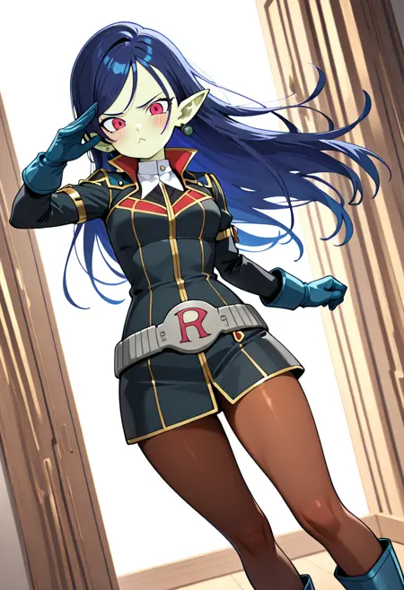 robelu_default,1girl,solo,blue hair,long hair,red eyes,pointy ears,colored skin,uniform,black jacket,belt,brown pantyhose,gloves,earrings,jewelry,boots,blue footwear,