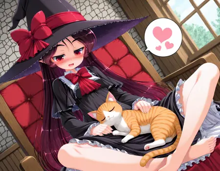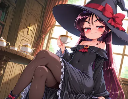 훈련 프롬프트: walkure_chocolat, 뾰족한 귀, 긴 머리, 붉은 눈, 마녀 모자, 검은 드레스, 프릴 드레스, 캐플렛, 리본