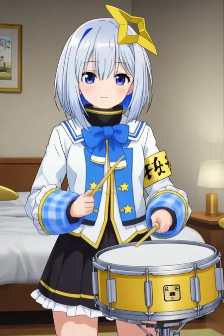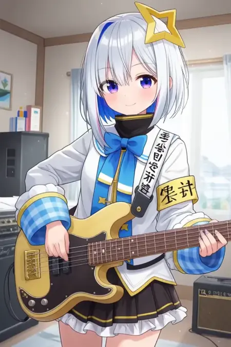 샘플 프롬프트: 아만에 카나타, 애니메이션 스타일 소녀. 이미지는 짧은 흰색 머리에 위에 노란 별 장신구가 있는 애니메이션 스타일 캐릭터를 특징으로 합니다. 캐릭터는 파란 눈을 가지고 있으며, 흰색 옷에 파란색 액센트가 있습니다. 옷에는 노란 리본이 달린 파란 스카프와 소매에 노란 별이 있는 체크 무늬 파란색 및 흰색 재킷이 포함됩니다. 흰색 블라우스, 검은 치마, 노랑과 검정 체크 무늬 앞치마로 구성된 해군 스타일 옷을 입고 있습니다. 앞치마에는 일본어 문자가 쓰여 있습니다. (그녀는 춤추고 있음:2.5), (치비 넌도로이드:3.5) 침실에서.