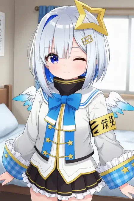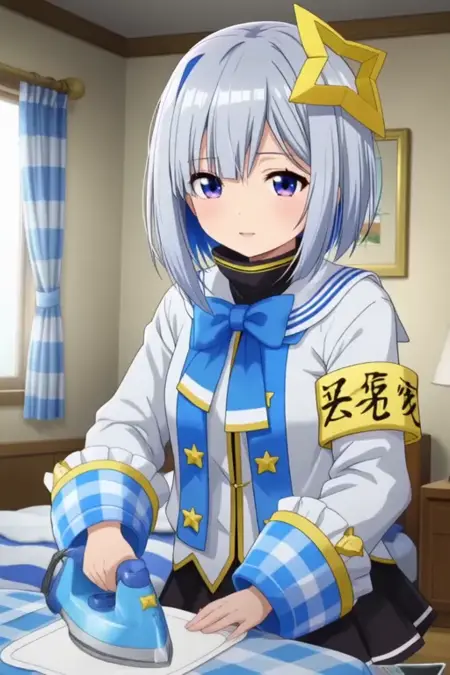 트리거 단어: 아만에 카나타, 애니메이션 스타일 소녀. 이미지는 짧은 흰색 머리에 위에 노란 별 장신구가 있는 애니메이션 스타일 캐릭터를 특징으로 합니다. 캐릭터는 파란 눈을 가지고 있으며, 흰색 옷에 파란색 액센트가 있습니다. 옷에는 노란 리본이 달린 파란 스카프와 소매에 노란 별이 있는 체크 무늬 파란색 및 흰색 재킷이 포함됩니다. 흰색 블라우스, 검은 치마, 노랑과 검정 체크 무늬 앞치마로 구성된 해군 스타일 옷을 입고 있습니다. 앞치마에는 일본어 문자가 쓰여 있습니다.