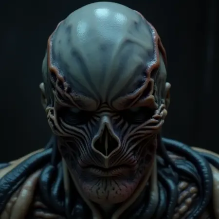 죽은 인간, 근육질 신체, 부패한 피부, 노출된 근육 조직, 호러 몬스터, 악마적 외형, 비틀린 해부학, 미끄러운 질감, 깊은 피부 균열, 검게 변한 정맥, 대머리, 오목한 코 구조, 특징 없는 회색 눈, 동공 없음, 골격 같은 입, 늘어난 손가락, 발톱 손, 시체 같은 피부, 빛나는 붉은 정맥, 비인간적인 인물, 저주받은 생물, 유기적 갑옷, 다크 판타지, 어두운 존재감, 뼈 위로 늘어난 피부, 초자연적 악당, 음산한 기운, 질감 있는 피부 표면, 사실적인 생물 디자인