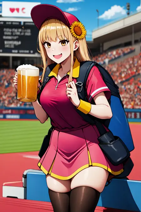 costume: wristband, yellow wristband, hair flower, sunflower hair ornament, baseball cap, (pink baseball cap:1.2), collared shirt, (pink collared shirt:1.2), short sleeves, skirt, (pink skirt:1.2), thighhighs, black thighhighs, zettai ryouiki,