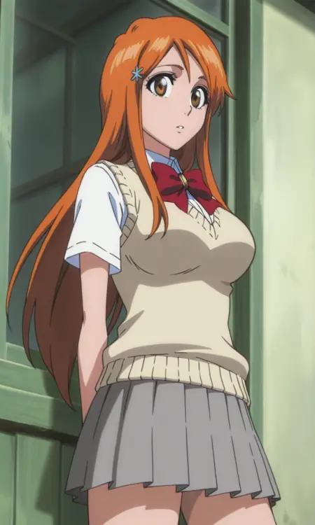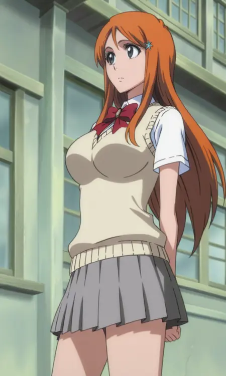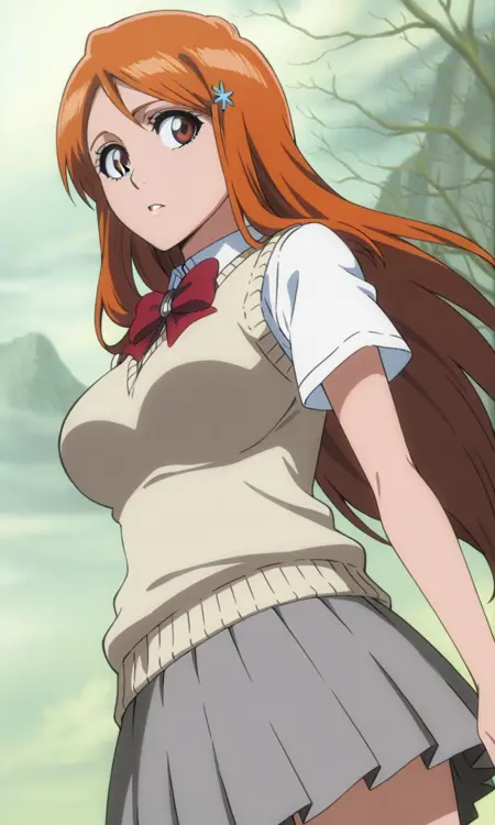 inoue orihime,1girl,solo,orange hair, brown eyes,long hair, hair ornament,hairpin, school uniform,red bow,white shirt,vest,sweater vest,pleated skirt,miniskirt,grey skirt,