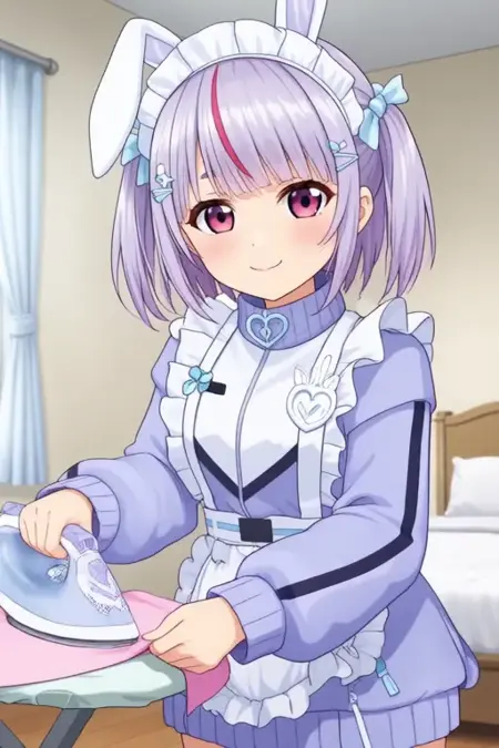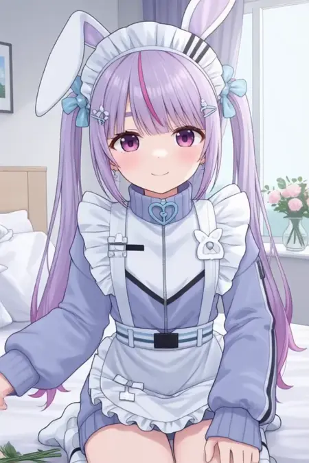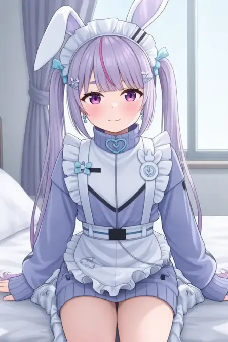 触发词:Tosaki Mimi,动漫风格女孩。画面中的角色为动漫风格,拥有浅紫色双马尾发型,表情柔和,面带微笑,大而富有表现力的紫色眼睛与粉嫩的脸颊。角色身穿浅蓝色服装,胸前带有心形徽章和白色领子,长袖配有荷叶边袖口,腰间系有腰带。角色还佩戴着与服装配套的兔耳和手套。下身穿着同色系的高腰短裙,裙摆呈荷叶边设计。服装搭配了多个小巧的蝴蝶结与丝带,增添了活泼俏皮的风格。