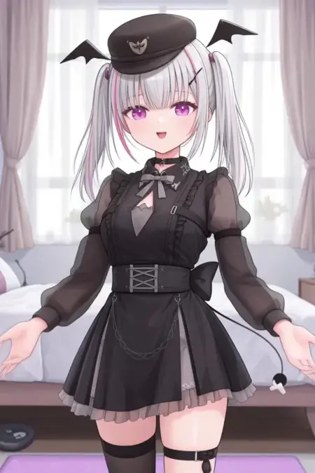 触发词:Asumi Sena,动漫风格女孩。画面中的角色为动漫风格,拥有长及双马尾的白色头发,发丝两侧带有粉色发饰。角色拥有大而富有表现力的紫色眼睛。她身穿一件黑色连衣裙,高领设计,袖子蓬松。裙身呈紧身胸衣样式,胸前系有蝴蝶结,腰间配有束腰带。裙摆短而褶皱,裙边缀有小蝴蝶结。角色还穿着及大腿的丝袜,配有黑色吊袜带,并戴着一顶带有蝙蝠翅膀的黑色帽子。