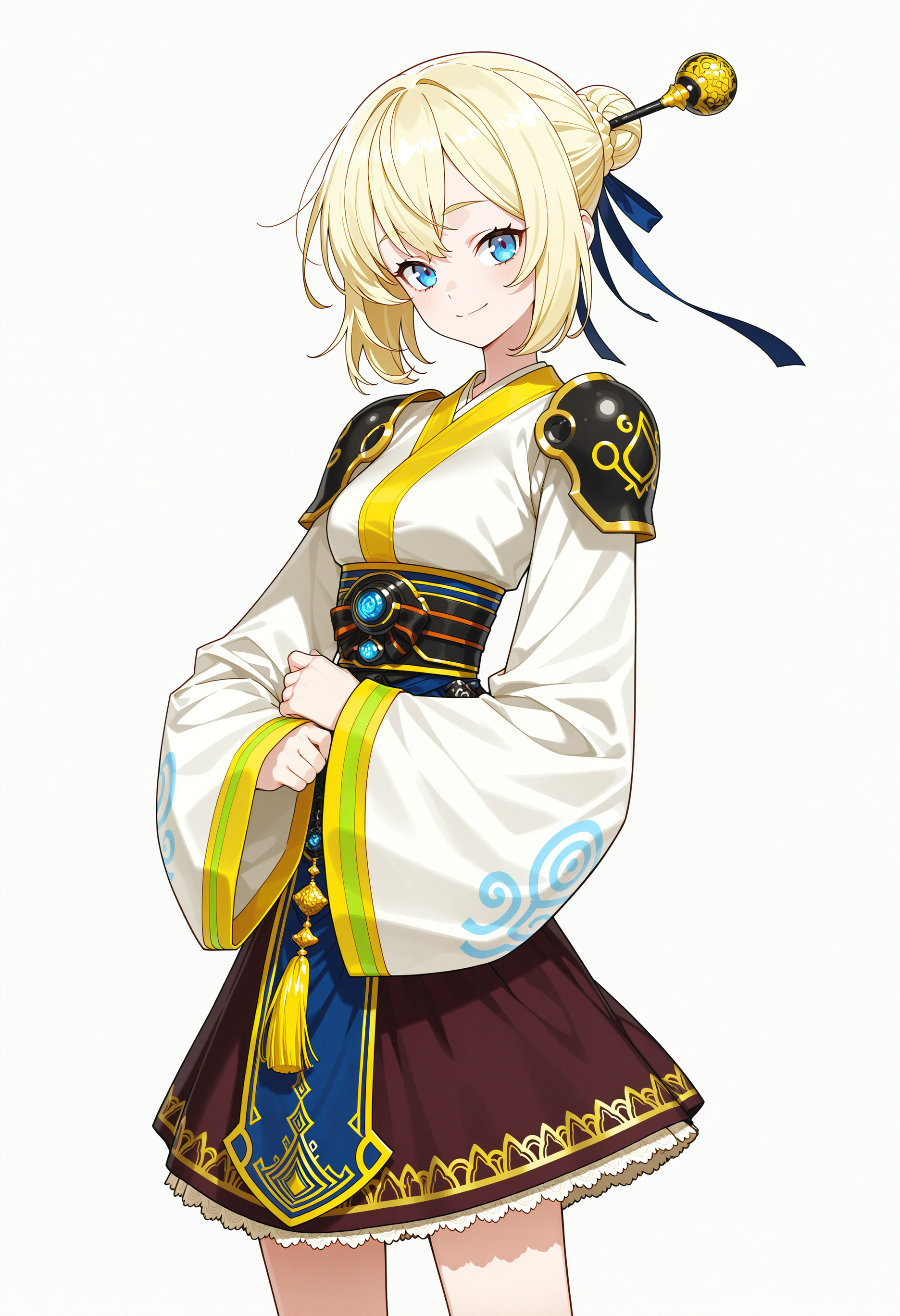 1girl, blonde hair, blue eyes, hair stick, single_hair_bun, hair up, short hair