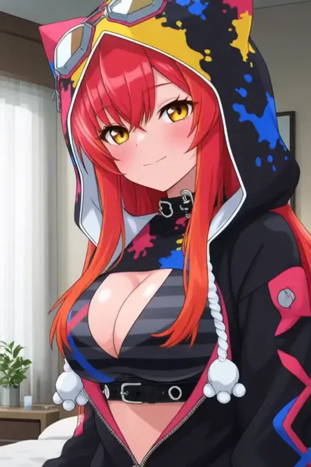 示例提示:Nekota Tsuna,动漫风格女孩。图像呈现一位动漫风格的角色,拥有鲜艳的红色长发,呈松散波浪状。角色拥有醒目的橙色眼睛,在肤色衬托下尤为突出。她身穿一件黑色连帽衫,帽兜上带有彩色溅洒图案,包含蓝色、黄色和红色等多种色调。连帽衫搭配一条黑色项圈,增添酷感。角色头顶还佩戴着一副护目镜。上身穿着黑白条纹高领上衣,露出一部分腰部肌肤。连帽衫前部有拉链,并装饰有多种配饰,包括一条带有链条的项圈,以及一条从项圈垂下的小巧白色毛绒装饰。(她正在跳舞:2.5),(Q版Nendoroid:3.5)在卧室中。