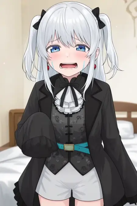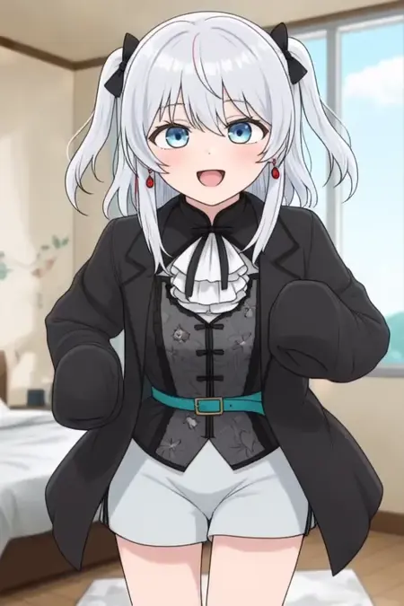 トリガー語: Nekomugi Tororo、アニメスタイルの女の子。画像には白髪で黒いリボンで結ばれたツインテールのアニメスタイルのキャラクターが描かれています。キャラクターは大きくて表情豊かな青い目を持ち、赤いイヤリングを着用しています。黒いコート(高めの襟)の下に白いラッフルシャツ、 teal 色のベルト(ゴールドのバックル)を身に着けています。服装には花模様の黒いベストと明るい色のショートパンツが含まれています。