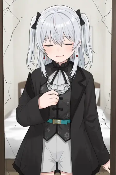サンプルプロンプト: Nekomugi Tororo、アニメスタイルの女の子。画像には白髪で黒いリボンで結ばれたツインテールのアニメスタイルのキャラクターが描かれています。キャラクターは大きくて表情豊かな青い目を持ち、赤いイヤリングを着用しています。黒いコート(高めの襟)の下に白いラッフルシャツ、teal 色のベルト(ゴールドのバックル)を身に着けています。服装には花模様の黒いベストと明るい色のショートパンツが含まれています。 (彼女は踊っている:2.5)、(ちびネンドロイド:3.5)、ベッドルームで。